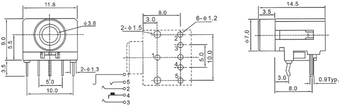 接触电阻 Contact Resistance ≤0.03Ω 寿命 Life 5000次